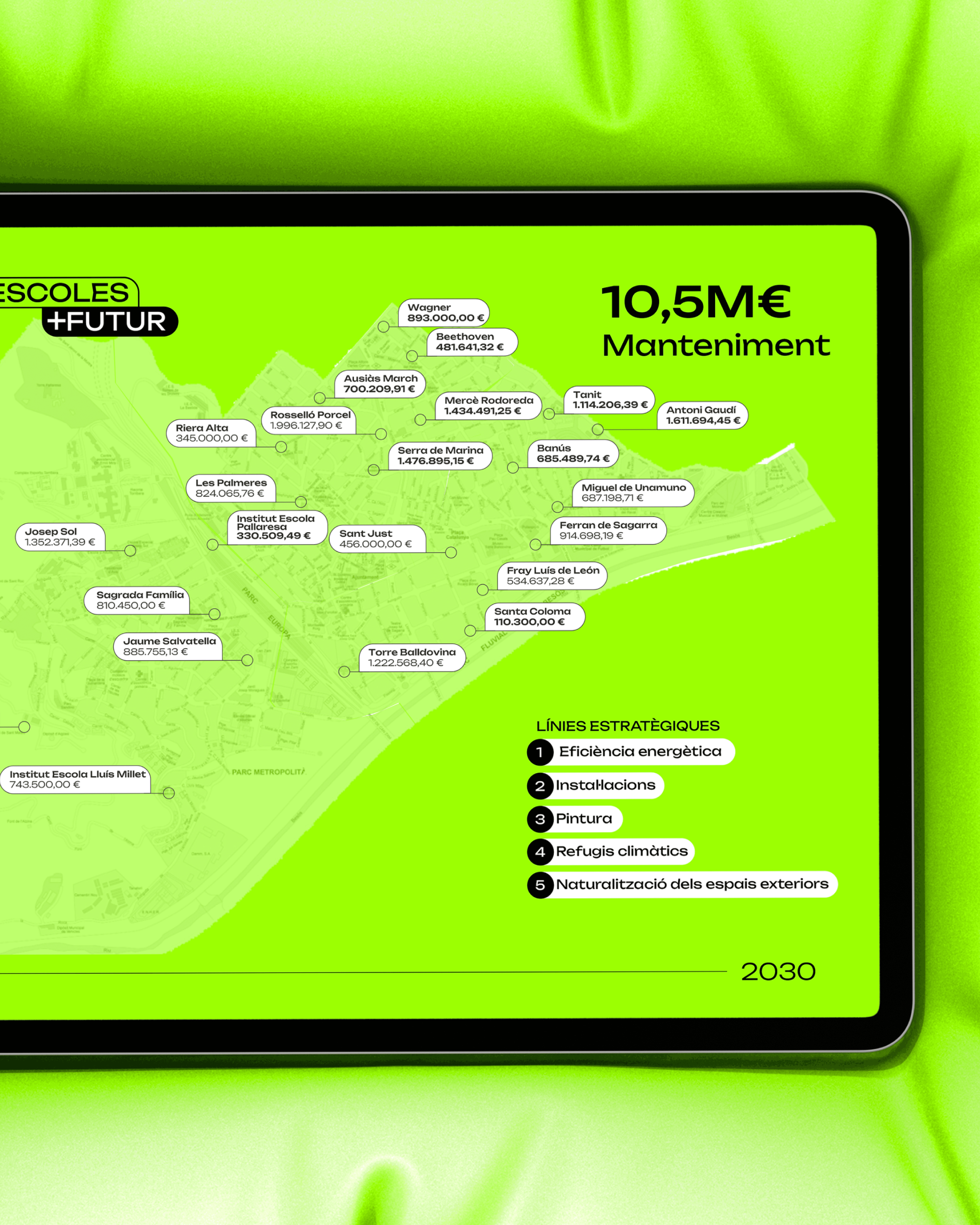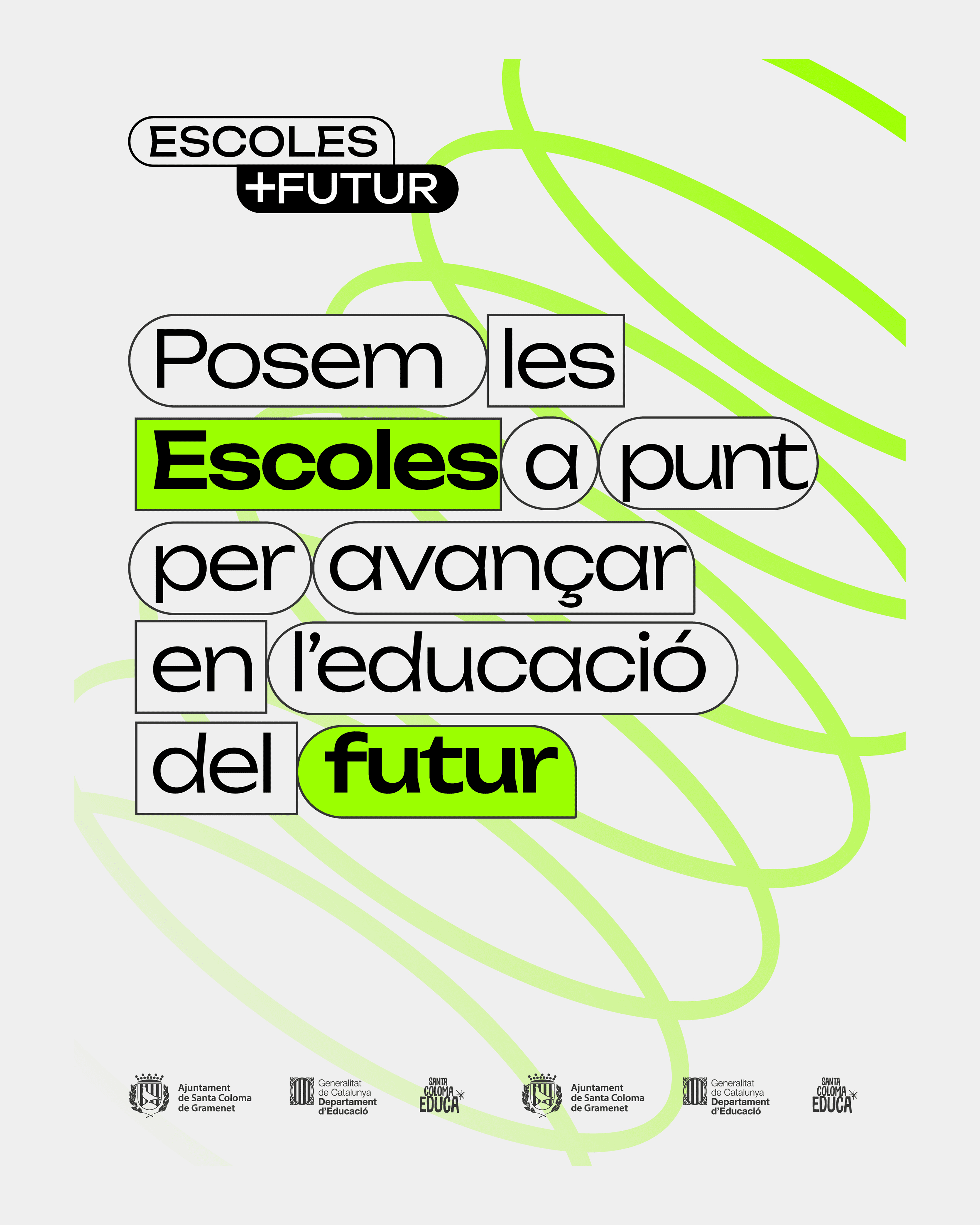 Disseny de la marca i desenvolupament gràfic d’Escoles Futur, un pla de projecte impulsat per l’Ajuntament de Santa Coloma de Gramenet per repensar els espais educatius i adaptar-los a les necessitats pedagògiques del present i del futur. El projecte inclou la construcció d’una identitat visual i un sistema gràfic pensat per acompanyar el programa, comunicar-ne els valors i donar coherència a les diferents peces i suports del pla.